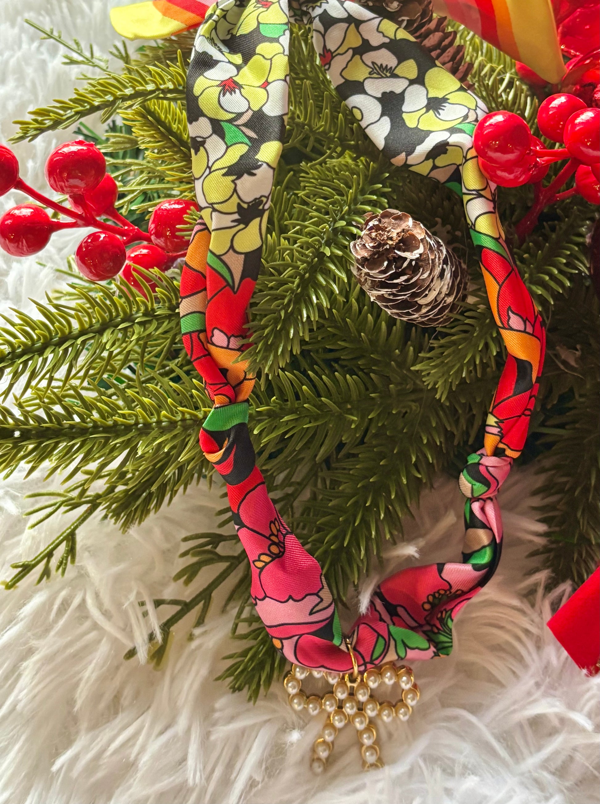 Chic meets charm in this Black Floral Scarf Charm Necklace featuring a dainty pearl-encrusted bow pendant. The black floral scarf brings an elegant contrast with soft, romantic florals, while the shimmering pearl bow adds a touch of grace and sophistication. Whether dressed up or down, this necklace is a timeless statement piece that effortlessly elevates any look.
