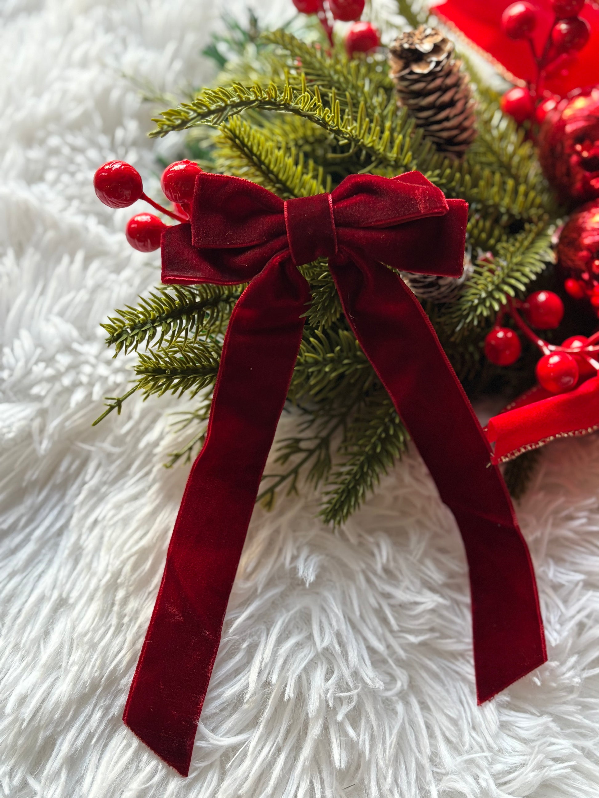 Add a femme festive touch to your look with this burgundy velvet hair bow.